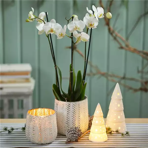 Kleine weiße LED-Bäume in unterschiedlichen Größen finden überall einen dekorativen Platz. Besonders winterlich wirken sie als Paar platziert. Der grün-weiß gestreifte Tischläufer bildet die perfekte Basis jedes Weihnachtsarrangements auf dem Tisch. Elegante Akzente setzen die Blütenfarben der Schmetterlingsorchidee (Phalaenopsis-Hybride) in Weiß, Gelb, Rosa, Violett und gezeichneten Blüten. Ihre drei Triebe erheben sich grazil aus dem wunderschönen Übertopf. Das gold-weiße Windlicht aus Glas setzt glänzende Akzente. Wer möchte, kann das Windlicht auch als Übertopf für seine Lieblingspflanzen verwenden.