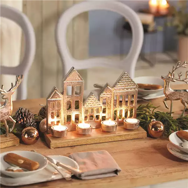 Die Häuserreihe mit Teelichthaltern erzeugt schöne Lichtspiele. Auf dem Esstisch oder einer Kommode platziert, mit weihnachtlichen Hirschfiguren ergänzt, erzeugt dieses ausgefallene Zusammenspiel eine besondere Stimmung.